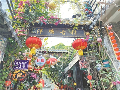 随着城市化的脚步,隐于闹市的泮塘村不可避免地简化了一些春节习俗,已经较少能看到家家户户蒸糕、迎醒狮的场景,但并不妨碍市民游客到村里走一走。在这里,红灯笼已挂起,三角梅、炮仗花开得正盛,许多民居和特色文艺店铺前布置着精致的小景,自有一番慢生活的惬意。