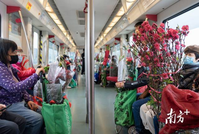 2月7日,广州地铁5号线滘口站,市民购买年花搭乘地铁五号线返回,车厢里鲜花满满,“鲜花列车”年味浓。