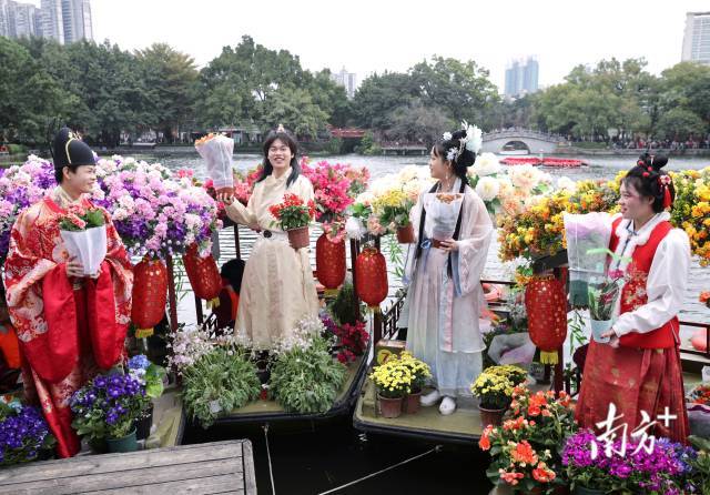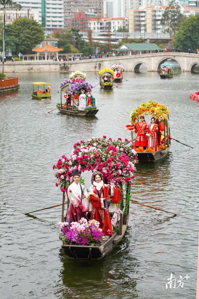 “西关小姐”乘坐十二艘特色花船在湖面巡游。岸边看花买花的市民人头攒动,独具荔湾特色的“水上花道”散发出阵阵广府“年味”。