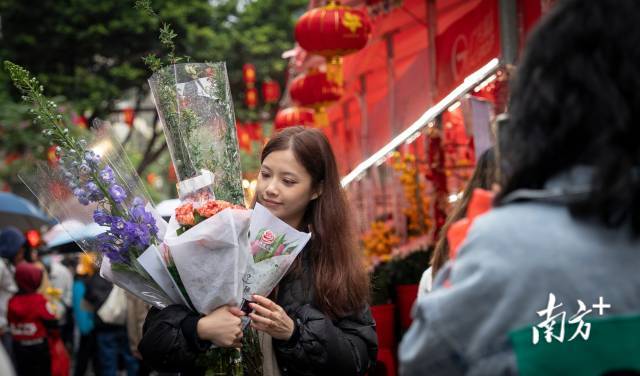 2月6日,广州越秀西湖花市,市民捧着满怀的鲜花拍照留念。