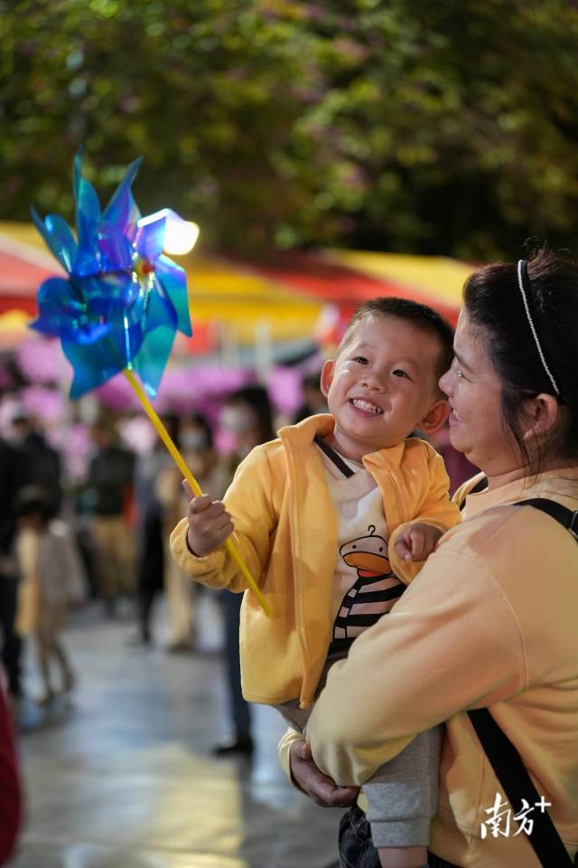 广州天河花市,人流涌动,孩童开心地玩着风车。