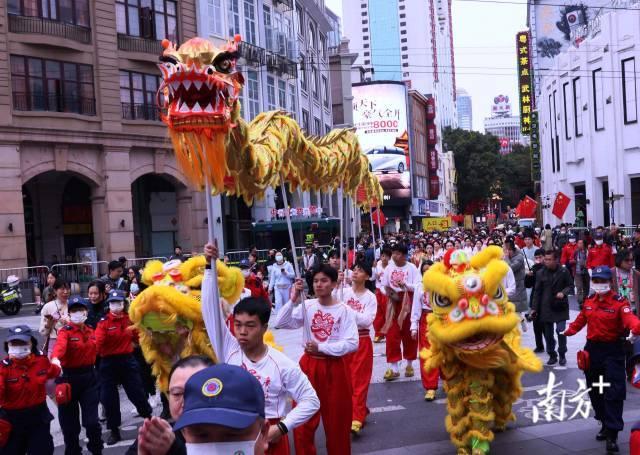 2月6日,广州越秀区西湖花市开市,在北京路上演精彩的舞狮舞龙巡游表演。