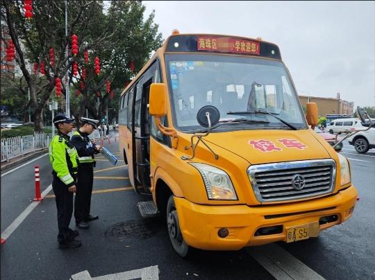 为保障全市校车及乘坐校车学生交通安全,进一步净化校园周边交通环境,广州交警提前进校开展校车检查,排查车辆、驾驶人安全隐患。开学首日,广州交警在全市范围内设置43个查车点,重点查处未取得校车标牌、不按规定线路行驶、不按规定站点停靠等交通违法行为。