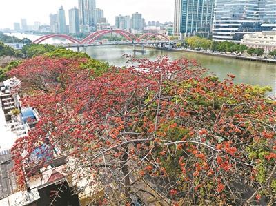 滨江路木棉绽放,和红色的解放桥相映成趣。 图/广州日报全媒体记者李波、苏俊杰、骆昌威、陈忧子、杨耀烨 摄