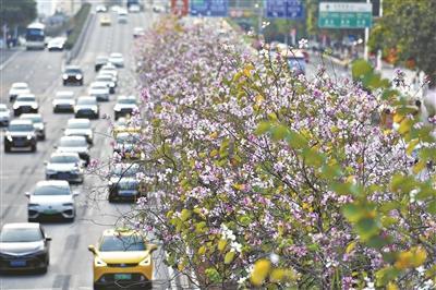 又到紫荆花开的时节,黄埔大道程介村公交站路段道路中间盛开的紫荆花。 图/广州日报全媒体记者李波、苏俊杰、骆昌威、陈忧子、杨耀烨 摄