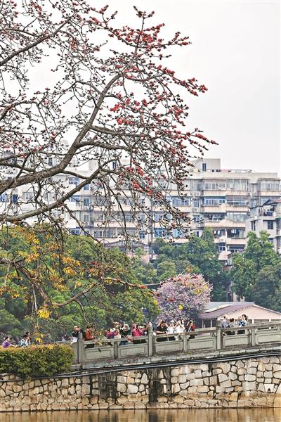 市民、游客在桥上赏木棉花。 图/广州日报全媒体记者李波、苏俊杰、骆昌威、陈忧子、杨耀烨 摄