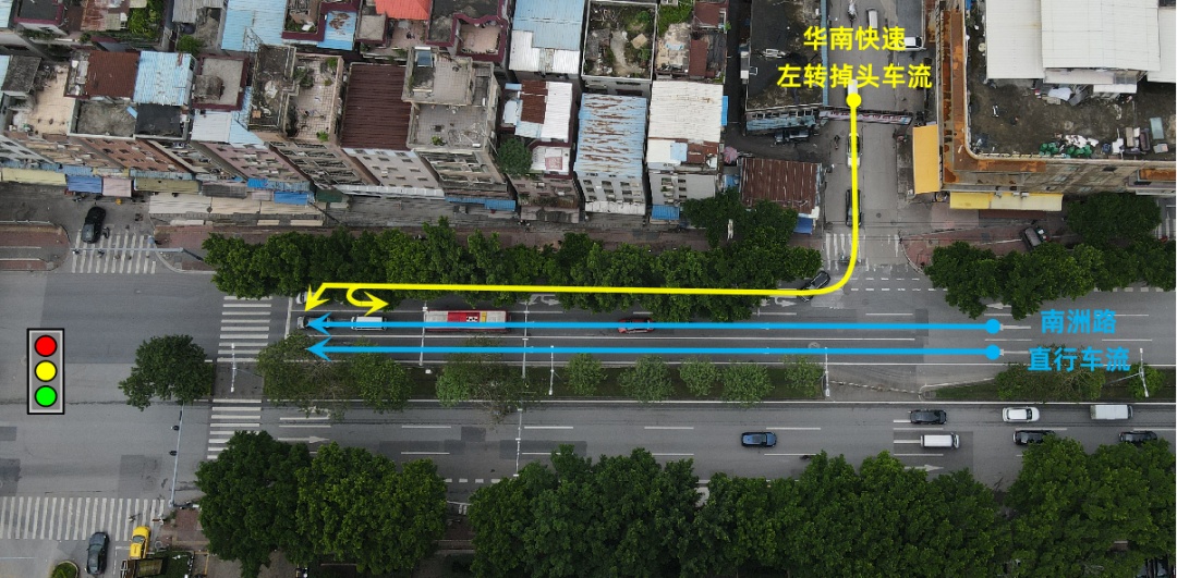 “一方面,我们因地制宜外置左转、掉头车道,减少车流交织。”广州交警介绍,依据车辆出行需求及路口实际情况,交警部门在南洲路罗马家园路口和南洲路看守所路口实施左转及掉头流向右置方案,并同步调整信号控制方案与增设分车道指示标志,以减少东往西方向车流交织的影响,提升路口的通行效率。