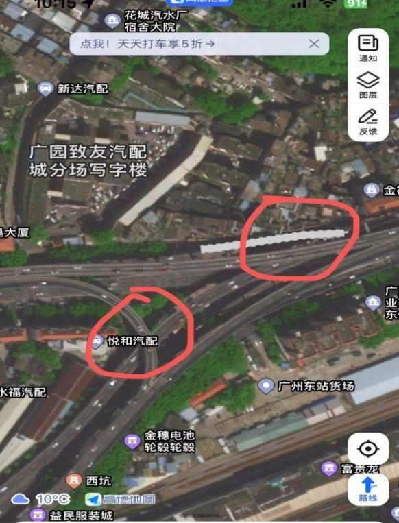 2月27日,广州市政协委员徐强告诉记者,在位于广州市中心区域的内环路A线行车道,两座立交桥衔接交叠处(如下图所示红圈处位置)的桥墩安全防撞问题亟需得到相关交通部门重视。