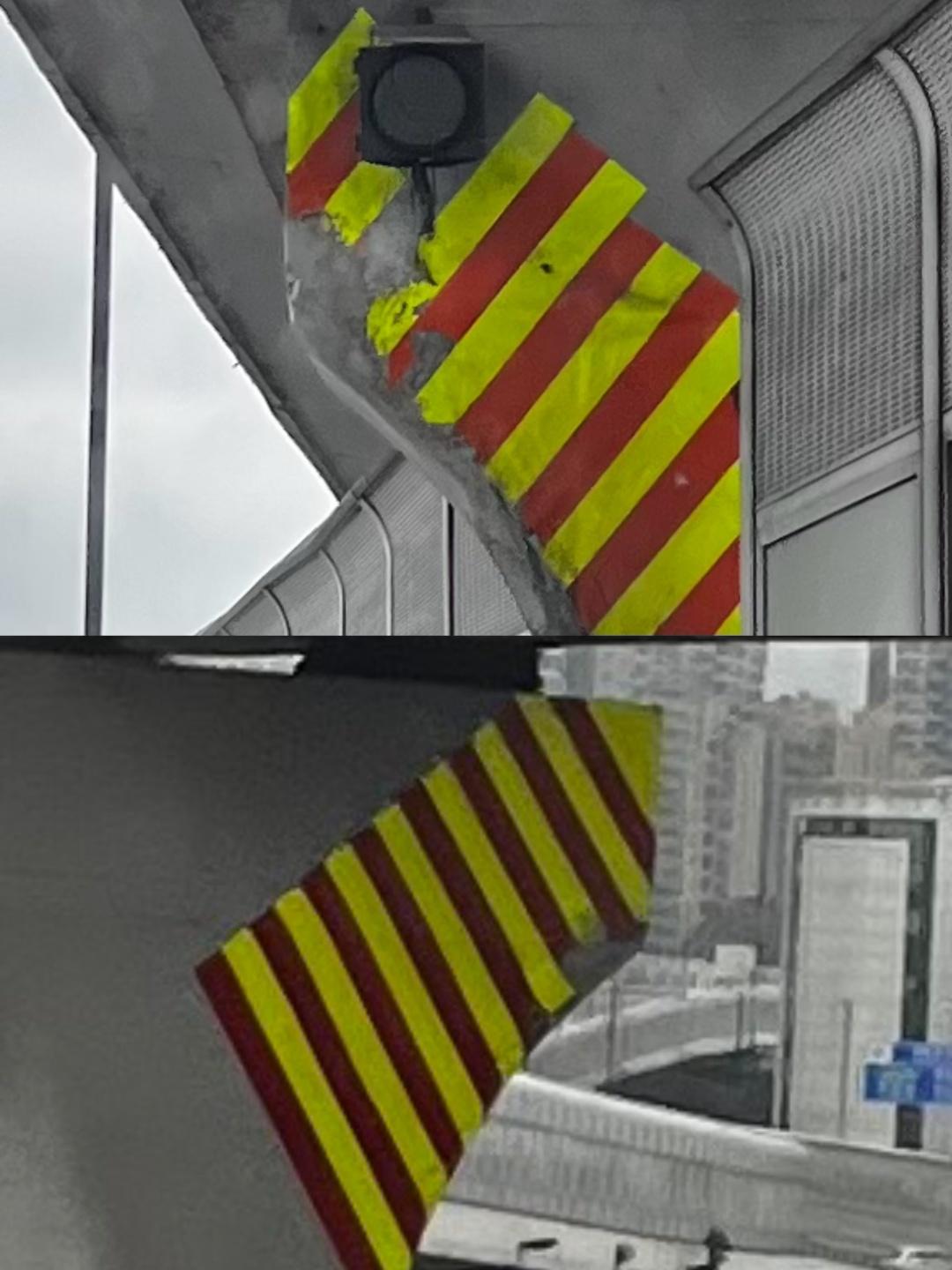 徐强说,“由于桥墩高度较低,途经车辆容易与桥墩发生碰撞,桥墩表面的碰撞痕迹日积月累现已数不胜数(如下图所示),由此可见在此处发生车辆与桥墩碰撞的安全隐患之大,而作为广州市中心区域极其重要的交通干线,内环路环绕广州市交通拥挤、人口密集、商业活动繁荣地带,若一朝在此,即两座立交桥交汇处的桥墩发生碰撞事故,其后果不堪设想。”