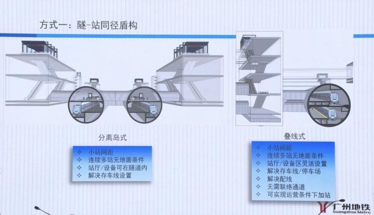 有没有解决办法?去年,广州地铁相关专家在公开论坛上介绍,目前正在研究采用隧道-车站同样直径的大盾构施工,实现在运营条件下加站;另外还有直径可伸缩的盾构,盾构机在隧道掘进的同时挖出部分站台空间,减少地面拆迁。这些新设备、新工法为地铁先行预留车站建设条件,后期等条件成熟再扩建车站提供了可能性。