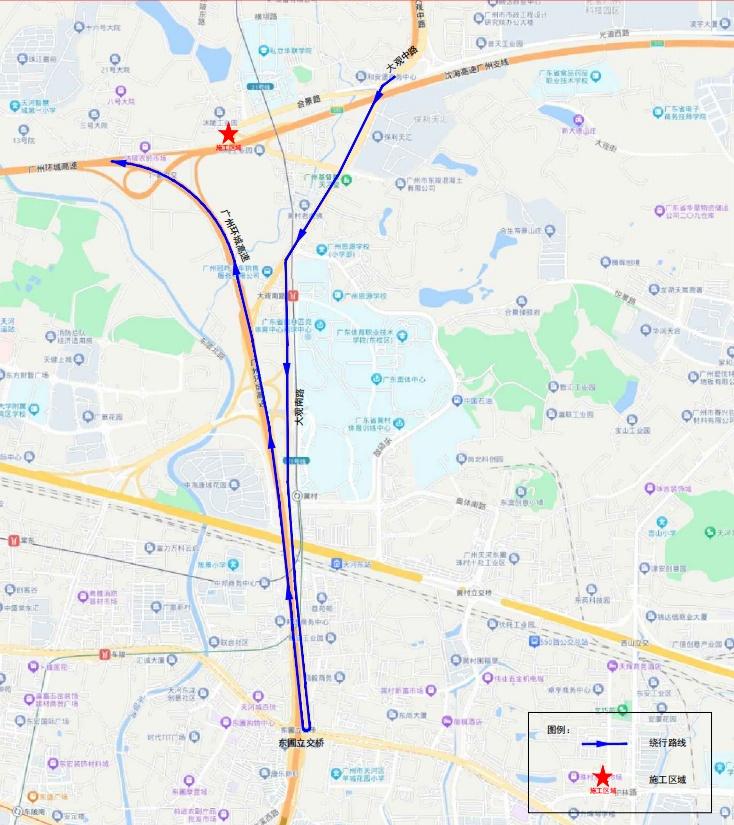 大型车辆绕行方案1:可通过大观中路—大观南路—东圃立交桥—东环高速路绕行。