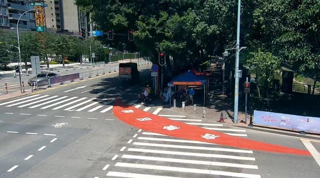 近年来,类似的交通事故已发生多宗,内轮差视野盲区不容忽视。为减少“内轮差”导致的交通事故,广州交警对大型车辆通行量较多的路口设置了右转危险警示区。该警示区是由大型车辆前后轮转向轨迹围成的区域,使用彩色涂料铺装,增加“危险区域”文字,以警示非机动车和行人禁止进入。