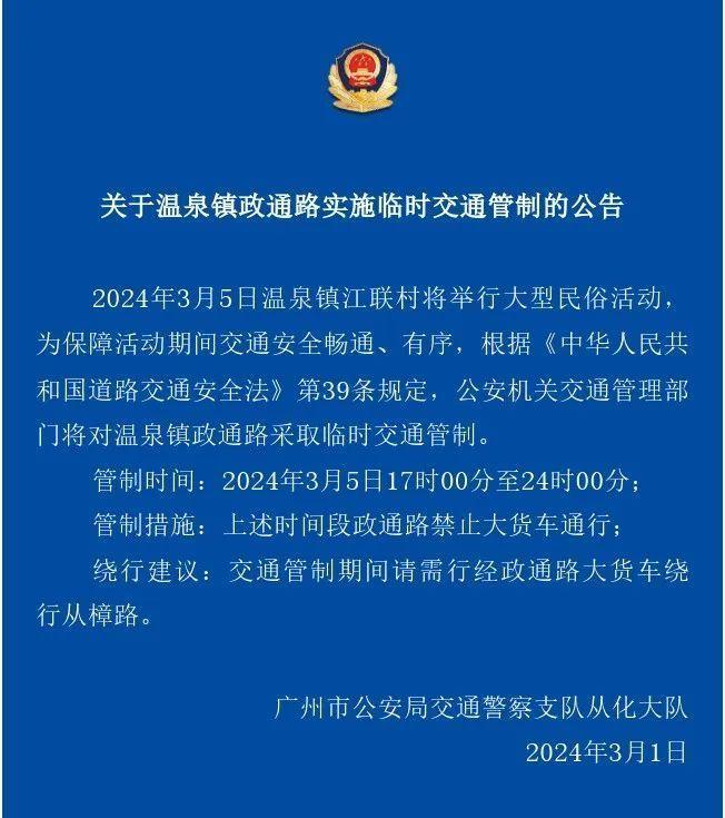 3月1日下午,广州市公安局交通警察支队从化大队发布公告称,2024年3月5日温泉镇江联村将举行大型民俗活动,为保障活动期间交通安全畅通、有序,根据有关规定,公安机关交通管理部门将对温泉镇政通路采取临时交通管制。