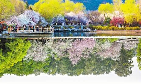 在高质量推进城园融合建设中,国家植物园持续开展彩化植物的研究推广,让人民群众春天能看到更多的花、秋天看到更多的彩叶、冬天看到更多的绿色。为了增加春季可观赏植物数量与种类,国家植物园还持续开展对新优植物的引种、研究,目前已拥有观赏桃品种70余个,是世界上拥有观赏桃品种最多的植物专类园。同时以国际海棠登录中心为依托,加强对海棠的研究、培育、收集和展示。目前已经集中收集了来自世界各地的200余个品种的观赏海棠,自主培育了“胭影”“雪柱”等海棠新品种,为彩化北京做出贡献。