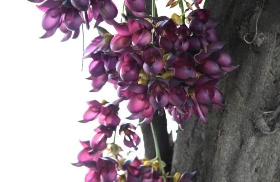 走进天龙溪禾雀花基地, 听着山间溪流潺潺的流水声,沿小溪旁一条林荫小道一路前行,5公里的赏花走廊随处可见成片成串的禾雀花,有白色、紫色、红色三种颜色。这里的禾雀花大多为自然野生,少量是后期人工培育的,一些粗壮的老藤上一串连一串,每串十朵、二十朵、三十朵、一百朵不等,串串下垂犹如鸟儿翩翩起舞,令人目不暇接。