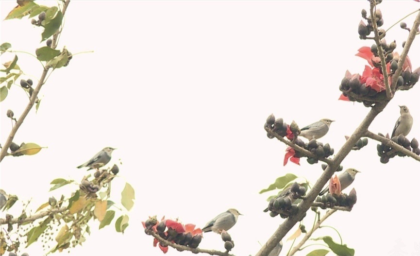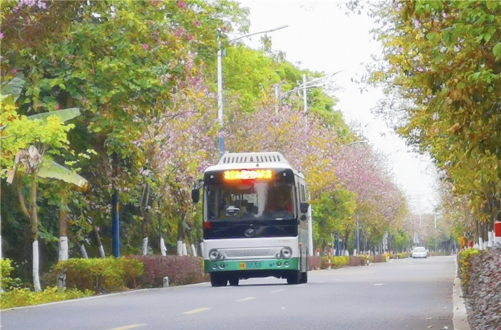 道路两旁宫粉紫荆、黄花风铃、木棉花盛开