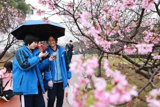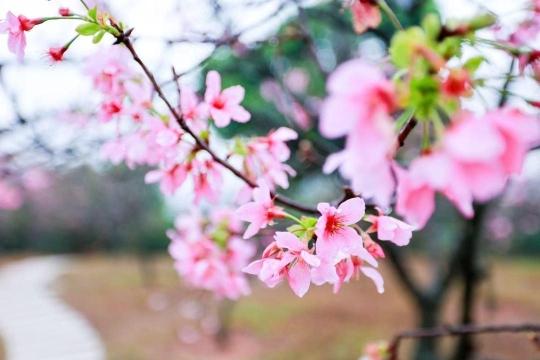 樱花园内粉色樱花绽放,随风摆动的花瓣散发出阵阵花香,令人心旷神怡。有几棵早早进入盛花期,成为樱花园内的“网红树”,游客争相拍照打卡留念。大岗镇有关负责人表示,十八罗汉山森林公园的樱花种植面积超过30亩,主要品种为广州樱,每年三月份进入开花期。受天气影响,预计樱花下周进入盛花期,盛花期将持续到本月中下旬。如果气温低,花期可以持续约半个月,如果气温高,花期将缩短。