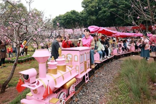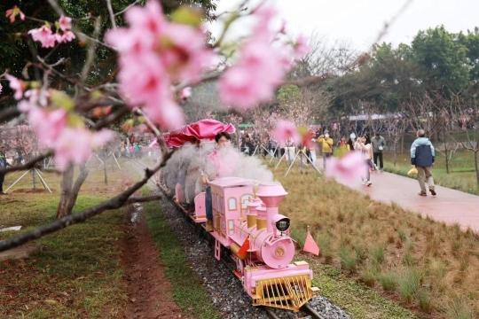 今年新开的樱花小火车备受欢迎。游客乘坐此次樱花节特别推出的“樱花小火车”穿梭花海中。除了浪漫樱花海,景区内十余里连绵翠岭,五千亩生态山林,营造出独特的赏游环境,让游客感受“一步一花海”的魅力。