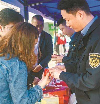 烟草专卖工作人员教消费者辨别假烟。