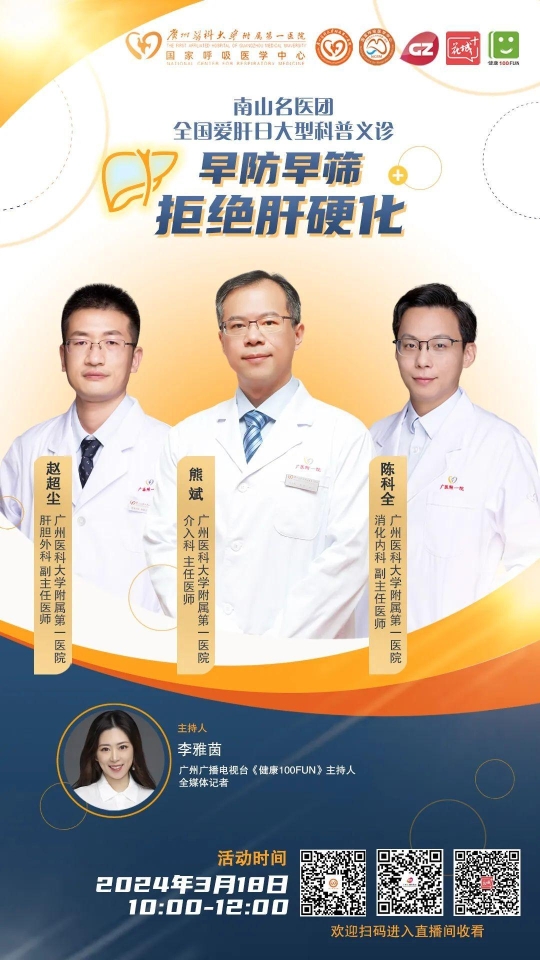 广州医科大学附属第一医院介入科主任医师熊斌、肝胆外科副主任医师赵超尘、消化内科副主任医师陈科全,一起为大家送上干货满满的爱肝日的“护肝手册”,现场盛况,请点击视频!