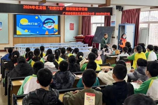 番禺区化龙镇东沙小学通过生动有趣的“扫黄打非”动画视频,让同学们了解远离不良信息、保护隐私等网络安全相关知识,讲座设置趣味互动小游戏,现场氛围活跃,学生热情高涨,争相回答问题,工作人员为积极抢答的学生送上小礼品。