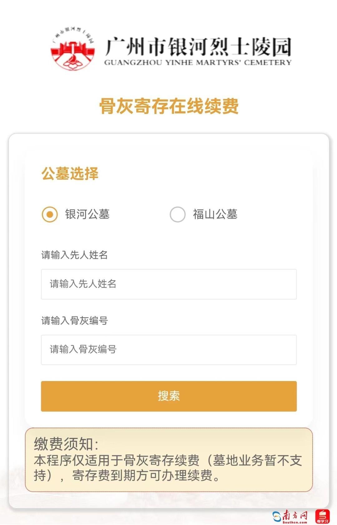 广州市银河烈士陵园管理处副主任刘荆武告诉记者,为方便市民办理骨灰寄存续费业务,近日全新推出网上办理渠道,市民可以通过“广州市银河烈士陵园”微信公众号,选择“在线续费”模块进行“骨灰寄存在线续费”,或者通过“微信”“支付宝”扫二维码进行缴费。