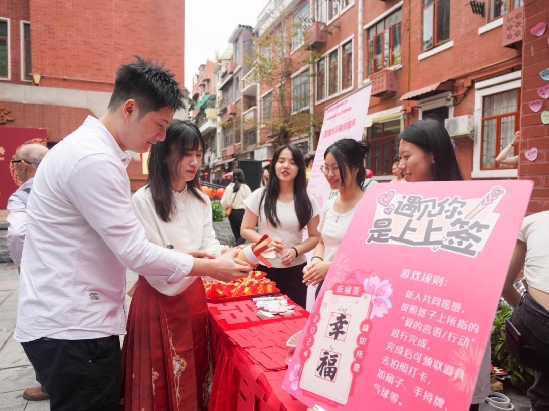 据了解,活动现场还设立“遇见你是上上签”亲密互动、“爱情电影”打卡点,供给新人游戏互动和拍照打卡。此外,特别增设“吃喜糖,沾喜气”婚俗改革进社区宣传摊位,吸引来往居民感受喜庆氛围并留言祝福,见证幸福和甜蜜,助力婚俗改革。