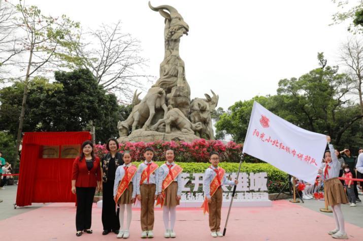 阳春三月,火红的英雄花开遍羊城。在温暖春光的照拂下,小北路小学“5+N”学生高质量发展创新基地揭牌仪式暨“英雄花开英雄城——红棉舞台”活动,在广州的标志——五羊石雕前举行。