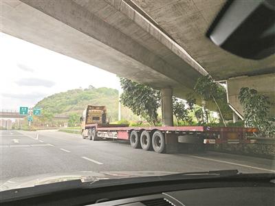 3月23日下午,记者跟随有关部门从佛清从高速出口驶入广从北路时看到,在交汇处右边车道隔离带违停了两辆重型货车。两辆货车车身庞大,将隔离带全部占据之余,左侧车轮还占用了机动车道的一部分。其他机动车行驶到此出口,都不得不留心车道右边的“庞然大物”,一边注意避让违停大货车,一边等候,直到左边无来车时才驶入广从北路。