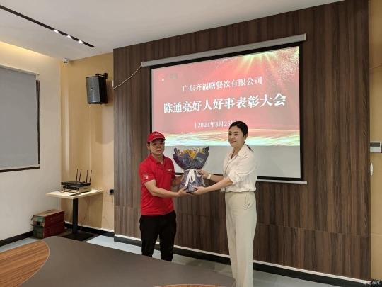 “陈通亮能够在他人生命遇到危险时挺身而出,大胆施救,这种见义勇为的行为让人非常感动,尤其他做好事不留名更值得点赞。他是我们应该学习的好榜样。”广东齐福膳餐饮有限公司负责人黄斯恒表示,举办这次表彰大会,希望每一位员工都以陈通亮为榜样,遇到这样的紧急情况都能勇敢地站出来,一起传播社会正能量。