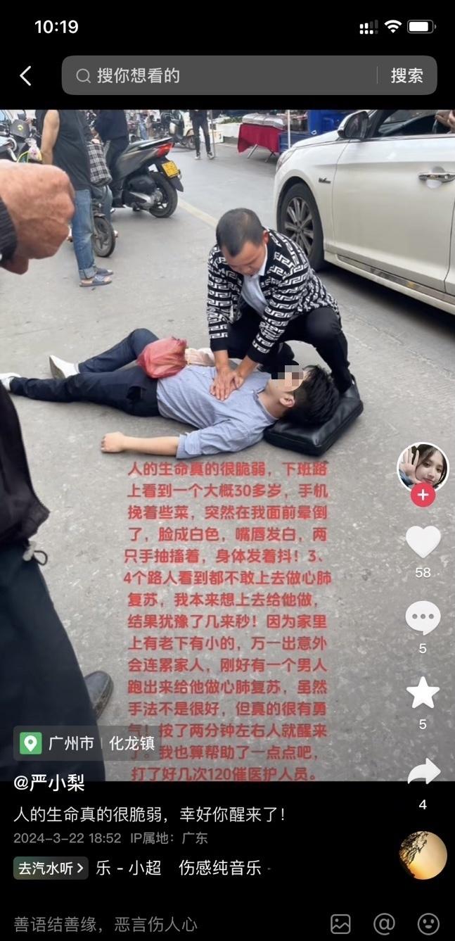 在闹市区马路上,一名年轻男子突然晕厥倒地,脸色发青、四肢抽搐、口吐白沫,情况危急,买菜路过的陈通亮见状,马上跪地施救,通过实施心肺复苏成功将昏厥年轻男子抢救回来。这是3月22日傍晚在广州市番禺区化龙镇龙源路上发生的暖心的一幕。