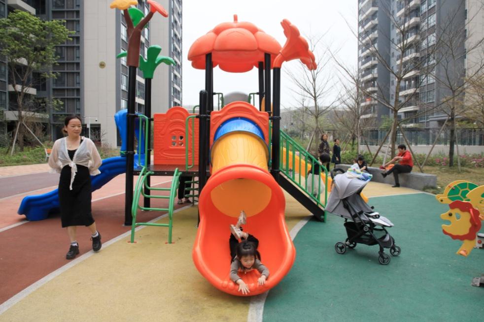 平西安置区,家长带着孩子在楼下的儿童游乐场玩耍。