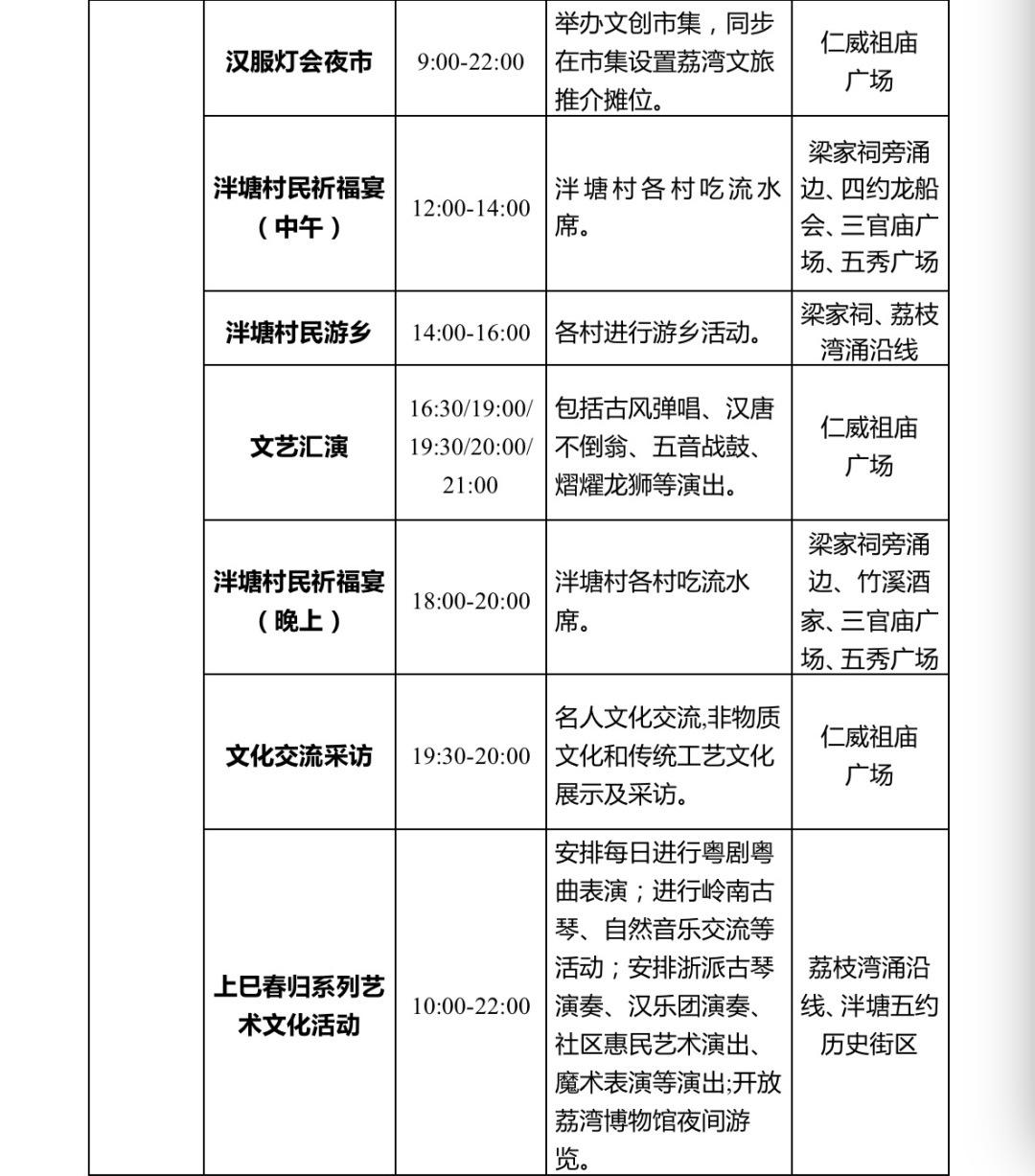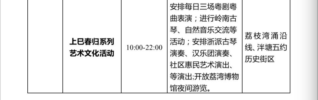活动期间,多场古风文艺演出、粤剧粤曲表演、名人文化交流讲座以及汉服灯会、文创夜市也将在傍晚时段在仁威祖庙广场和荔枝湾大戏台等区域开启,同步进行荔湾博物馆夜间开放,为市民游客提供更多观赏时段和出行选择,日夜呈现全景式上巳节民俗大赏。