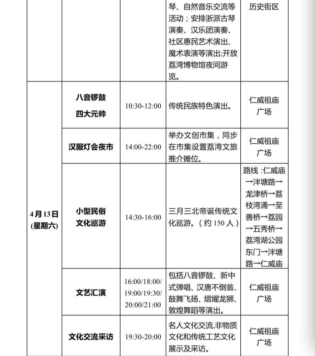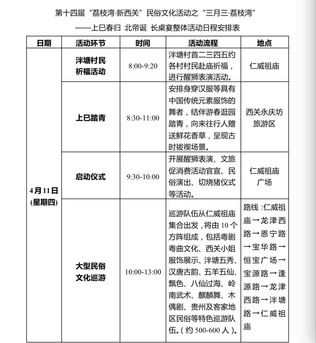 4月11日,第十四届“荔枝湾·新西关”民俗文化活动之“三月三·荔枝湾”——上巳春归 北帝诞长桌宴活动启动仪式将在泮塘仁威祖庙举行。泮塘村民将开展巡游、祈福、舞狮、游乡、祈福宴等民俗活动。
