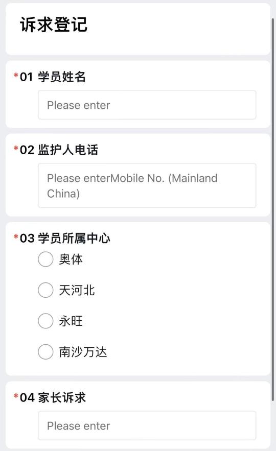 如果对两个方案还是不满意,还可以扫描另一处二维码提交登记诉求。记者扫描后看到,诉求登记需要提供学员姓名、监护人电话、学员所属门店以及家长诉求。现场工作人员表示,家长还可以联系客服电话和添加客服微信提出诉求,对于家长的诉求,金宝贝会在7天后答复。
