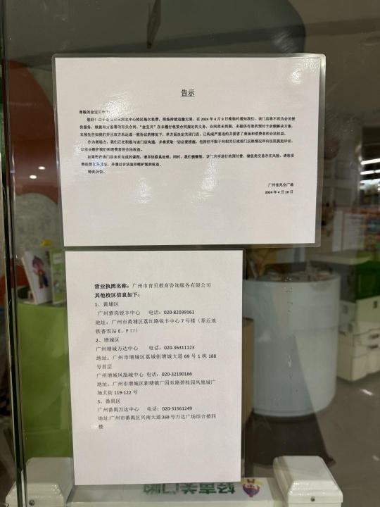 4月10日下午,记者来到位于天河区中石化大厦佳兆业广场二楼的金宝贝早教门店,发现该门店大门紧闭,门口贴有广州佳兆业广场的告示。