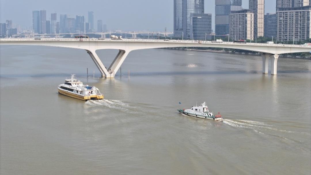 广州内港海事处东河海巡执法大队副队长林国雄介绍:“我们加强对高速客船航经水域的交通组织和船舶疏导,重点提醒珠江口等重点水域过往船舶要加强瞭望、注意避让。同时采取‘海巡船艇+无人机’的模式,对高速客船进出港进行立体护航。”