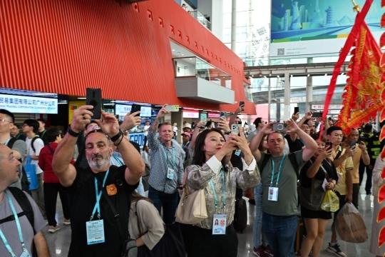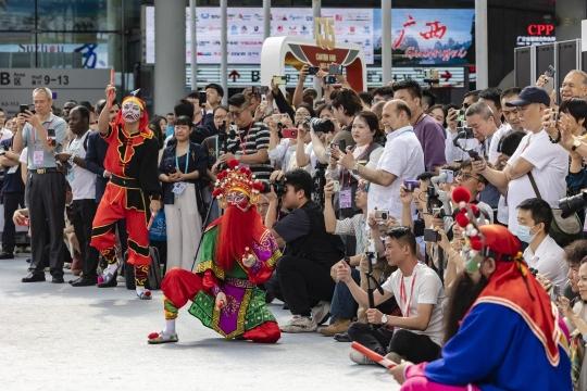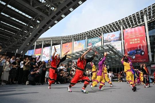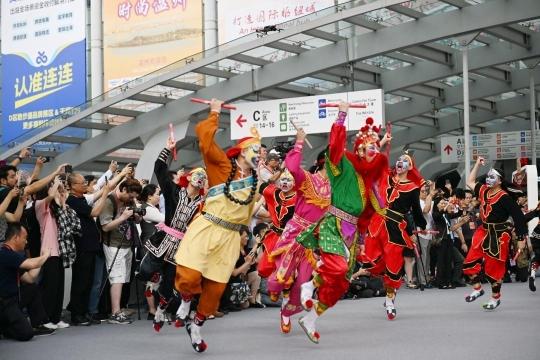 第135届广交会开展当日早晨,展馆内迎来潮汕英歌舞展演,不少境内外采购商驻足观看。