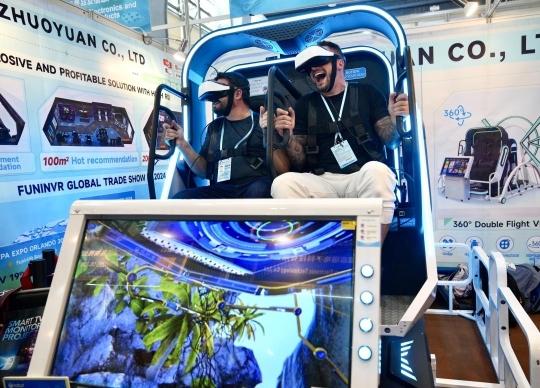 广州卓远虚拟现实科技股份有限公司的展位人头熙攘,不少采购商正在排队体验VR虚拟游戏,现场气氛瞬间变嗨。来自巴西的采购商Cleber是第一次玩VR虚拟游戏。尽管已经做了一点心理准备,但当年游戏开始,他与同伴还是发出了“惊声尖叫”,一阵惊叫,一阵欢笑、一阵吓跳。游戏结束后,Cleber与同伴情不自禁地鼓起掌来,连呼中国产vr游戏“太真实”“太让人兴奋”。卓远虚拟现实科技股份有限公司外贸总监梁幸媚告诉记者,虽然国外也有类似的VR产品,但还是中国的相关相关“更加厉害”,“因为我们的产品种类更丰富,国际市场上大部分产品都局限于‘过山车’等一些比较简单的产品,但我们的产品会添加更多设计特效,还会有一些科普作用,例如会涉及航天航空主题以及地震主题”,梁幸媚说,“作为广州本地的专精特新小巨人企业,在研发方面的投入达到我们整体年销售额的7%。”