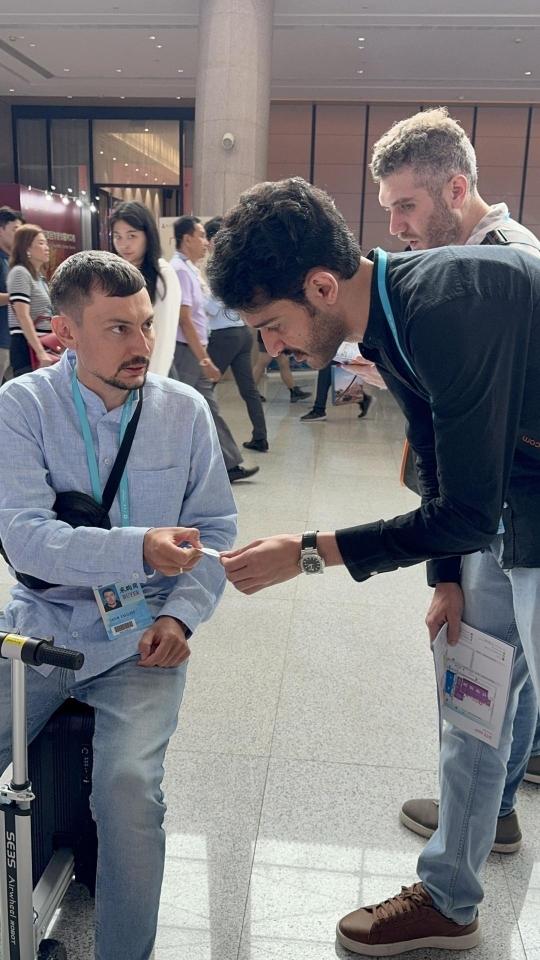 俄罗斯采购商Vadim(左)与现场询价的客商交换联系方式。