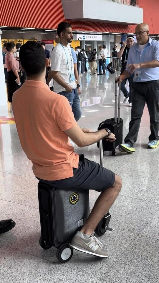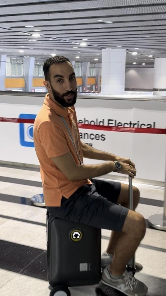 摩洛哥小伙Zed在广交会上买到一只电动行李箱,开心地穿梭于展馆中。