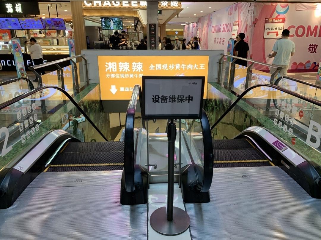 4月18日,广州日报全媒体记者再次来到事发现场,看到涉事电梯已经停运,挂出“设备维保中”的告示牌,并用围栏围蔽。另一边的对向电梯也处于停运状态。在电梯不远处的商场入口,有工作人员负责指引携带大件行李的顾客前往另一个电梯搭乘。