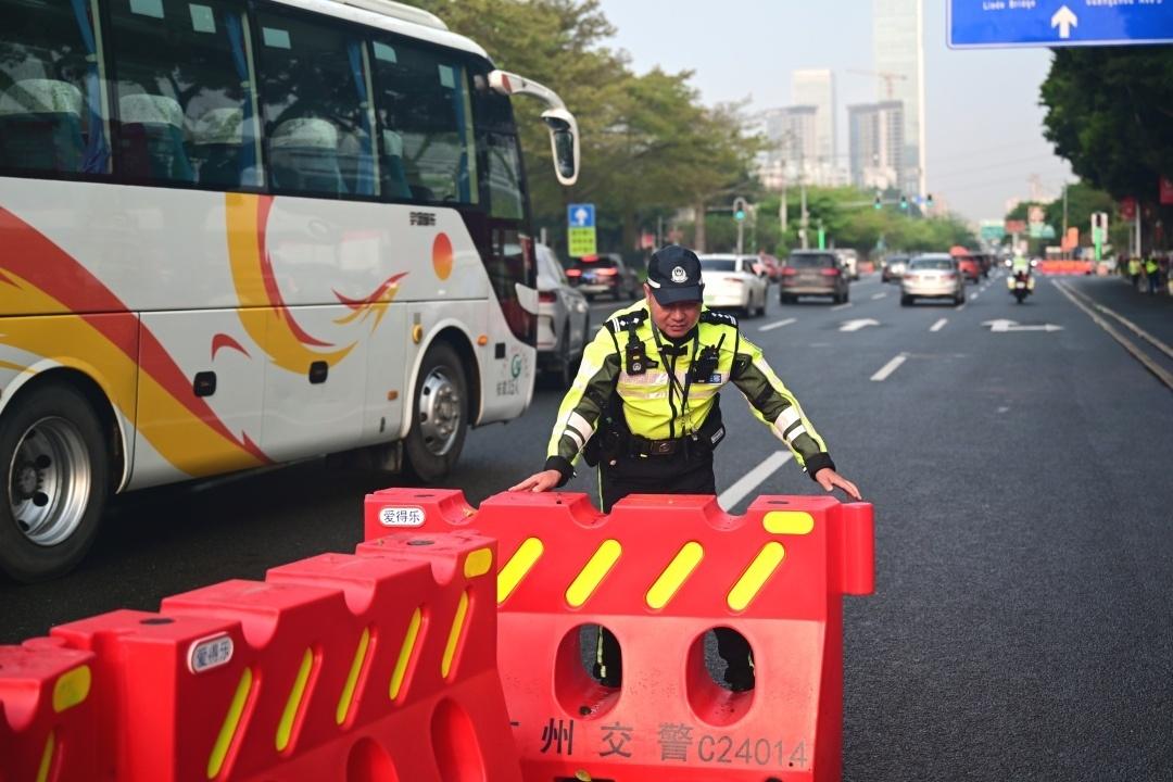 为做好本届广交会安保工作,广州警方进一步优化了展馆人、车流交通线路,完善人、车进退场和门区安检流线。在展馆内各主要通行路段完善交通指示标志等,重要路口、路段等设置拉链式硬质隔离设施,加派人员值守,高峰时段采取动态潮汐式分批放行车辆和行人,做好展会活动点线的交通指挥和疏导工作,避免出现人车抢道和严重拥堵等情况,通过“广州公安”“广州交警”等官方自媒体及时发布交通指引。