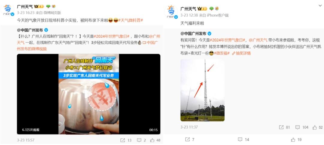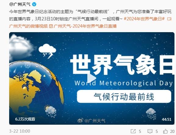 世界气象日之际,“广州天气”微博号于10时开始主题直播活动,累计有6.2万次观看。同时,连发两条微博,以视频形式关注开放日活动之回南天实验课、科普讲座等现场情况。期间,@广州天气 联动@中国广州发布 科普气象知识,取得良好传播效果。如@广州天气 转发@中国广州发布 的微博视频“什么?广州人在线制作‘回南天’?!”,实录开放日现场科普小实验,累计有6.3万次观看;@广州天气 联动@中国广州发布 通过矩阵问答形式和奖品机制,提高网民参与热情,有超200人参与该活动。