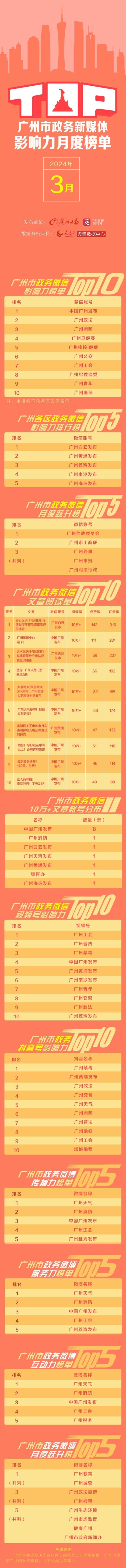 由广州日报主办、人民网舆情数据中心提供数据分析支持的广州市政务新媒体影响力榜单(2024年3月榜)于2024年4月23日正式公布。2024年3月,广州市政务新媒体重点关注广州城市规划、清明节放假安排及祭扫通告、校外培训违法行为等经济民生方面,以及大地磁暴、强对流天气等气象预警信息。同时,电动自行车安全问题引发群众热议。