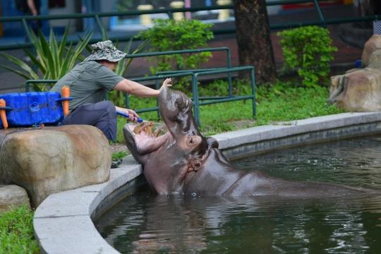 在众多长工龄动物中,1976年出生的亚洲象“宝龙”以48年的超长工龄拔得头筹,44岁的非洲象“哈威”和亚洲象“跃龙”名列前茅;40岁的黑猩猩“曼莉”在灵长区首屈一指;4只年过30岁的亚达伯拉象龟在盘龙苑内默默坚守;30岁的“阿清”和25岁“憨达”则在河马馆繁衍生息。记者在河马池外看到,“憨达”在“刷牙”后追着保育员抛下的玩具玩耍,显得干劲十足。