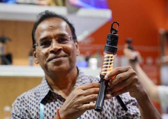 4月16日广交会上,一款集成了灭蚊灯、野营灯、充电器、手电筒为一体的户外多功能灯引起了不少客商的注意。