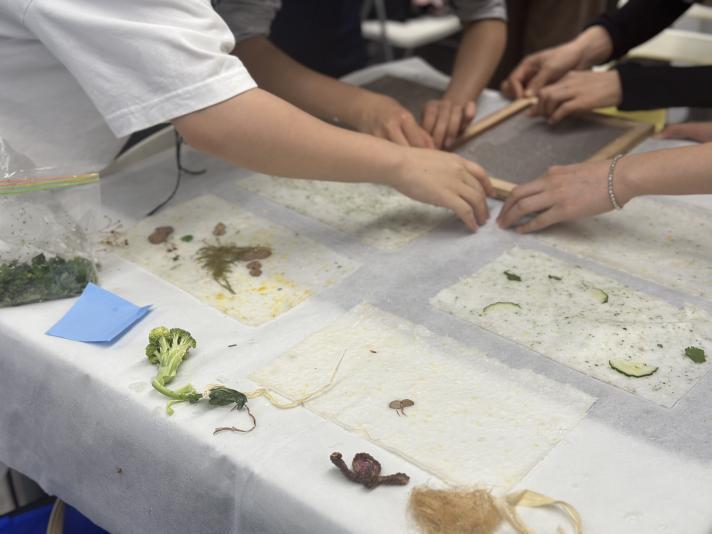 广州图书馆创客空间,读者利用积攒下来的食材余料与纸浆混合、压制再生纸。