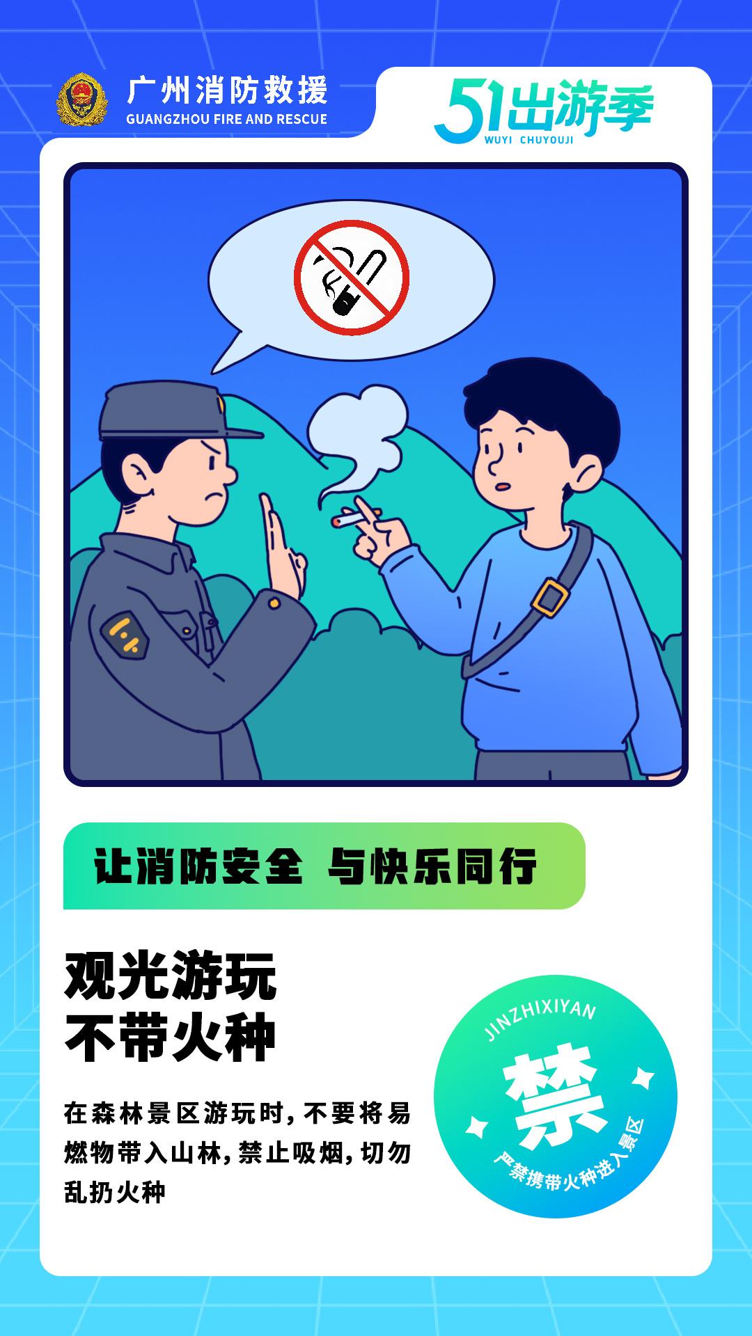 “五一”假期期间,外出旅游、购物、娱乐活动增多,公共场所、旅游景区、餐饮住宿等场所人流、物流、车流聚集增多,致灾因素明显增多,极易引发火灾事故。为此,广州市消防救援支队发布“五一”假期消防安全提示,提醒公众注意节日期间消防安全,共度欢乐平安的“五一”假期。