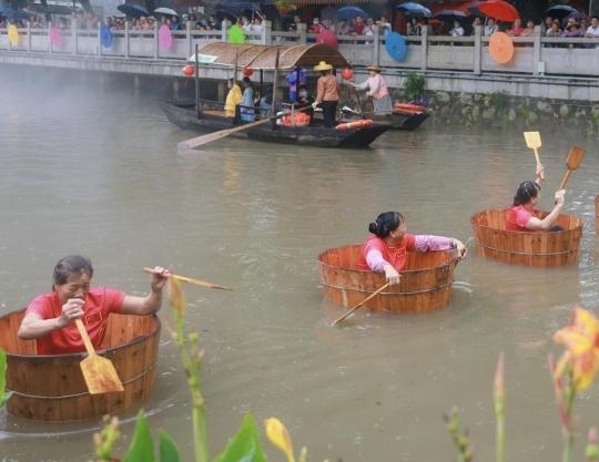 小桥流水,古韵悠悠。濠涌碧绿的河面上,一个个小圆桶缓缓驶入人们的视野,广州南沙东涌镇特色的“发斗”表演正在精彩上演。
